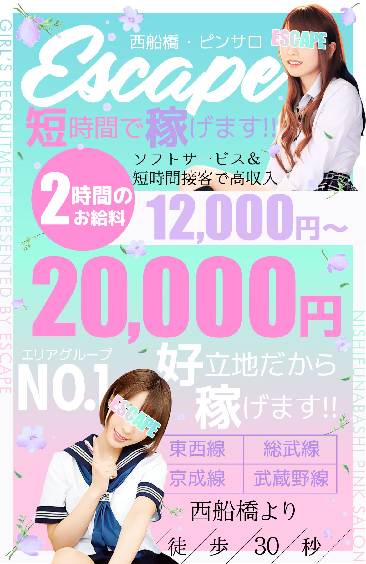 千葉県船橋・西船橋エリアで高収入バイトをお探しなら『西船橋エスケープ』へ!年中無休で営業しています。ぜひ空いたお時間で面接・体験入店からお試しください。